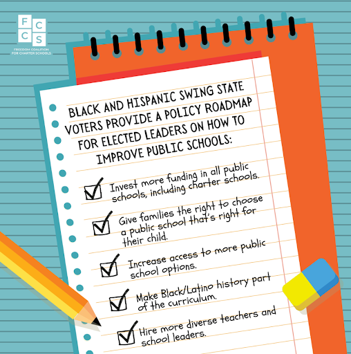 A new survey by FCCS shows Black and Latino swing state voters sounding the alarm: they want lawmakers to offer families more public school options and say zip codes should not determine where children can attend school. These voters’ education experiences tell them the current K-12 public education system is not meeting their needs and public schools are failing kids of color.
